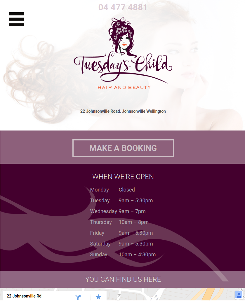 Johnsonville-based Tuesday's Child Hair and Beauty required a new website showcasing their business. We built a single-page mobile-friendly Wordpress template to meet their needs.